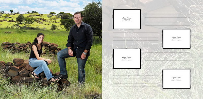 Nicole and Jason own a beautiful wedding venue outside Rustenburg, and the surrounding bushveld was the setting for the guest book photos. After a latish night that i spent in their company over a fantastic braai,and their great hospitality, I knocked on their door just after sunrise (ok maybe an hour or so later) to start the photo session. Mostly natural light and side filled flash was used for the shoot, to keep that rustic feel in the pictures. Their Big Greek Wedding took place at Sandton Sun, but they still need to narrow the photo selection down before I can put their storybook up on the web. I took a photo of each couple at the wedding, hence the blank spaces in the book to stick the pics in.